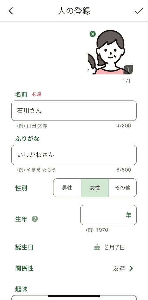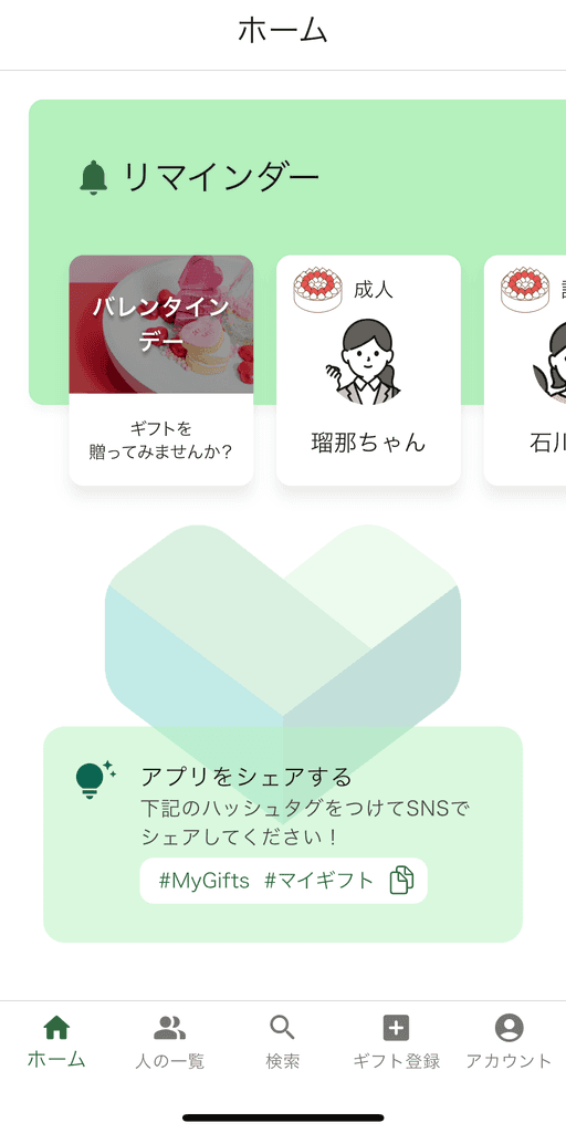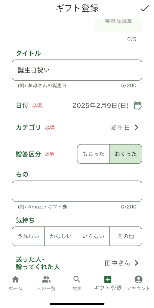 いつ、誰に/誰から、なんのイベントのために、どんなプレゼントを贈った/貰った、その時の気持ちは?といったプレゼントに関する情報を、数回のタップと入力で登録することができます。